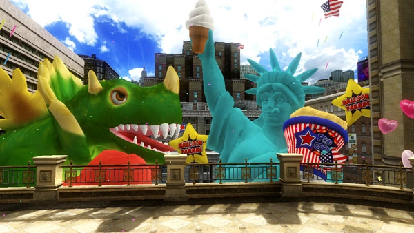 El escenario se desarrolla en el balcón de un edificio donde al fondo se puede ver gente vestida de etiqueta y camareros. Las personas situadas a los lados cerca de las mesas y sillas sirven como paredes y como barandilla del balcón. Al otro lado se puede ver un desfile de globos. Además, hay una pared rompible que conduce al interior del edificio donde se puede ver la pelota.