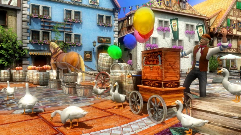 Los jugadores pelean en la plaza del pueblo con patos esparcidos por todos lados. Se puede ver gente mirando, como un vendedor y un niño con su madre. La gente lleva ropa tradicional alemana. También hay un caballo parado en una parte del escenario, junto con algunos globos. También hay muchas calabazas encima de numerosos barriles.