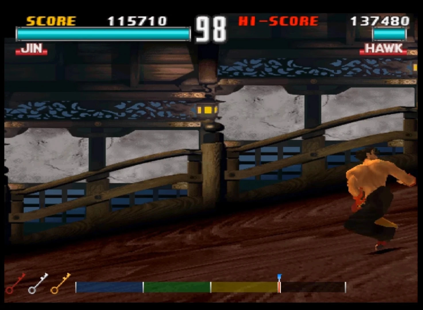 Etapa 3: En la oscuridad en Tekken Force (Tekken 3). El jugador es Jin Kazama luchando contra Falcon.