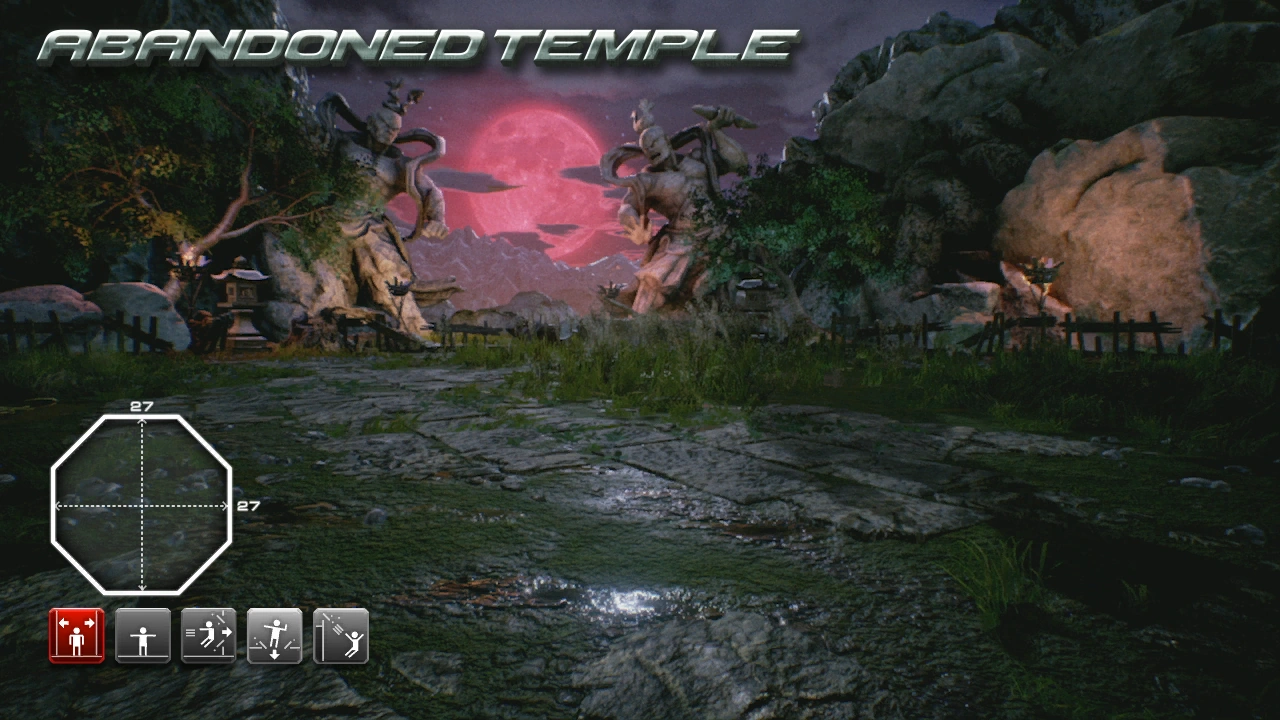 As the name suggests, the stage is set outside of a Buddhist temple located amid a fairly rocky region. The area looks somewhat unkempt, with grass growing in an erratic pattern around the area, suggesting it is not visited often. There are torches set up around the outside of the arena to provide light in the middle. There are several statues visible, including two large Nio statues, Buddhist figures that are commonly associated with Akuma.