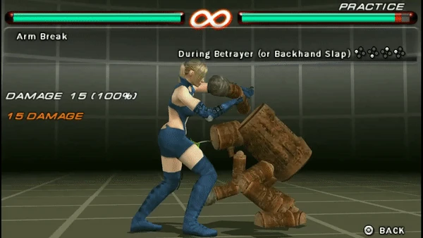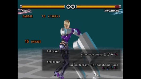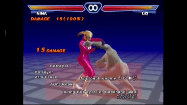 From Tekken 3 onward, Nina can also perform Arm Break after Betrayer. In Tekken 3 only, Anna could reverse Arm Break's escape with d/b+1+4, allowing her to perform the same throw reversal later given to Chaos Judgement.