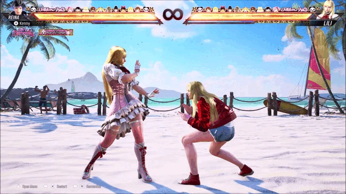 Reina stands up from a crouched position and steps slightly off to the left before performing a right backhand to the opponent, throwing them into a pirouette stun.