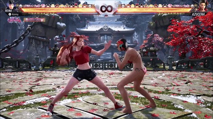 Reina performs two crossing punch strikes with her right hand to the opponent's face then spins into a low horse-stance backhand to the midsection with the same hand before ending on a Thunder God Fist. The first two hits of the string are a natural combo.