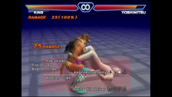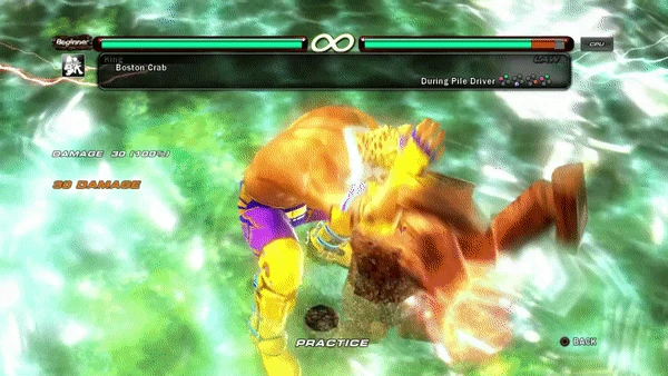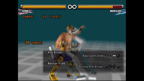Boston Crab (ボストンクラブ Bosuton Kurabu?) is a throw exclusive to King I and King II since Tekken 2. The user must delay the input of this move by a minimum of 10 frames, or the Double Arm Face Buster will be performed instead. Total damage for this move is 50, as King performs the Pile Driver (25 damage) first before turning his opponent over and snapping their legs. In the original Ver.A arcade release of Tekken 2, the move dealt 45 damage (70 including the Pile Driver), but was nerfed to 25 damage in the Ver.B release.