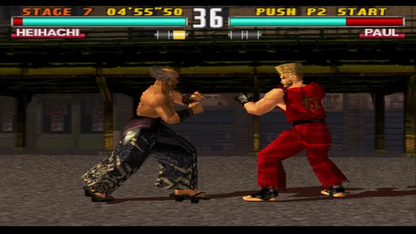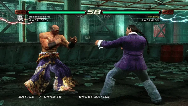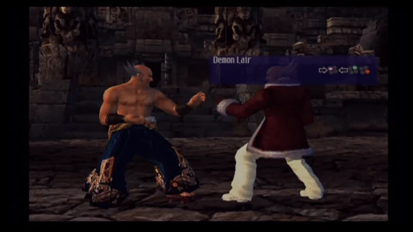 The move consists of a left jab, before Heihachi spins, drops into a horse stance, and executes a right backfist. He then stands, springs up, twists, and performs a right-footed jumping side kick.