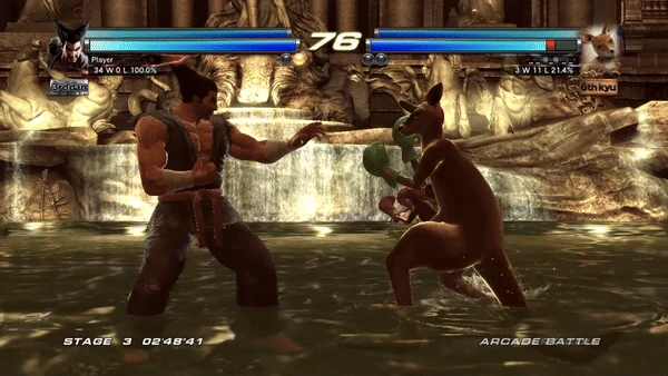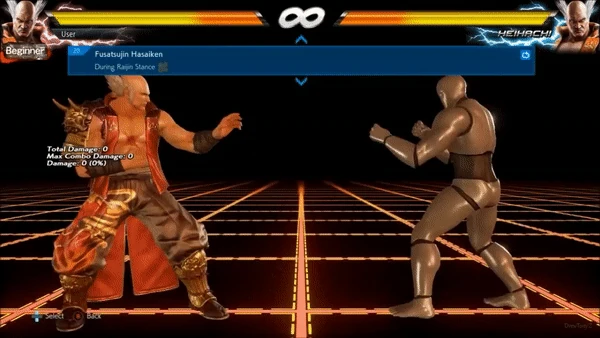 From the Raijin Stance, Heihachi takes a swift step forward and hits his opponent with a fast left hook to the face, throwing them far away. It has homing properties and induces a launch state on counter hit.