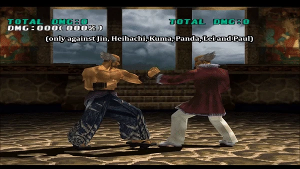 The escape to this move is 1+2. This move can also be reversed by pressing 1 or 2 just before the hit connects, which makes the opponent headbutt him back. Heihachi can reverse the reversal by doing the same. This sequence can potentially last infinitely if done in practice mode, as every reversed headbutt can be reversed leading to a loop.