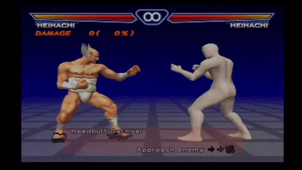 The difference in animation is that instead of the opponent being knocked to the ground, they are pushed away and electricity surrounds Heihachi's head. Another difference is that Headbutt Carnival can only be performed against certain characters. If playing against a character that is not among these few, the grab will not initiate and Heihachi will do a regular attack instead.