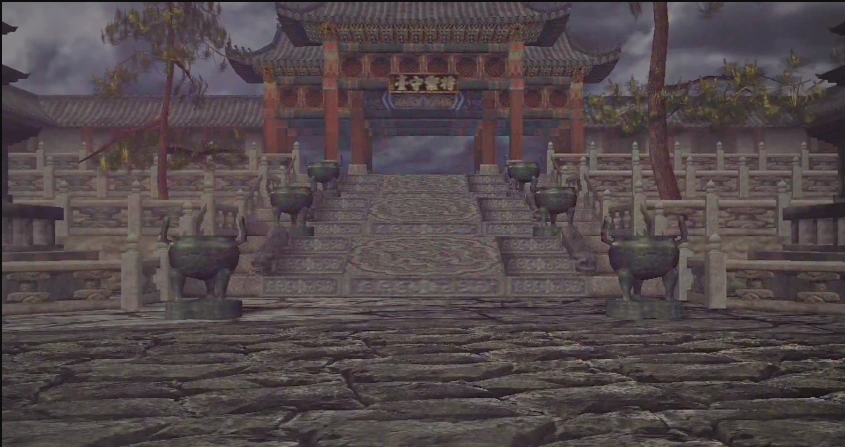 The stage takes place at an Korean Buddhist temple. The weather is stormy and it is possible to see lightning in the sky, illuminating the course at the same time. There is typical Asian architecture with pagoda-shaped roofs. Two stone pagodas face each other. Stairs lead from each side to different parts of the temple. Various copper incense burners are placed at the steps and smoke is seen escaping from them.