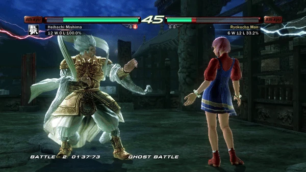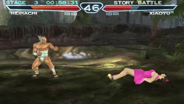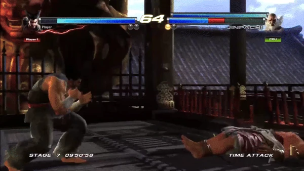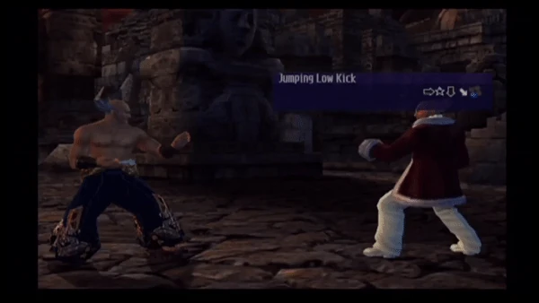 Heihachi enters the Wind God Step then performs a short hop before spinning in the air and executing a low sweep with his left foot.