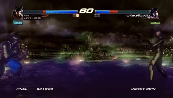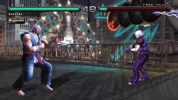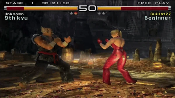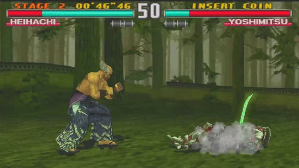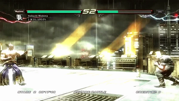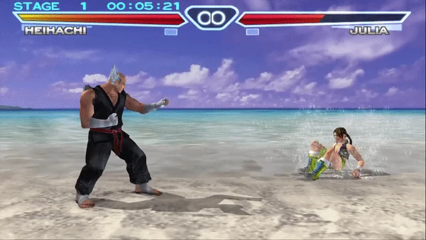 Done from the Wind God Step, Heihachi hops up slightly then performs a spinning sidekick to the opponent's midsection. In Tekken 8 this causes chip damage on a blocking opponent.