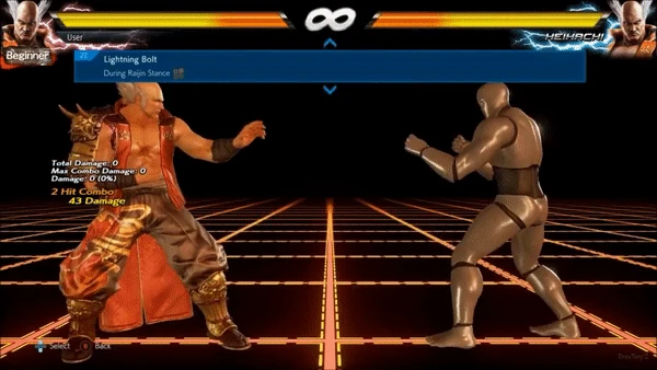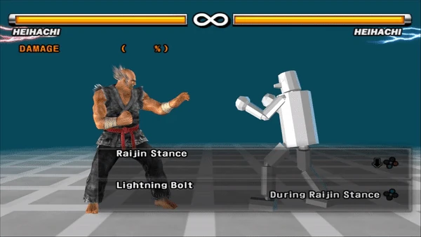 From Raijin Stance, Heihachi rears back to focus power into his right fist before lunging forward with an unblockable right punch aimed at the opponent's head, causing the opponent to crumple to the ground on hit. Though the move is unblockable, it can be ducked as with any high attack.