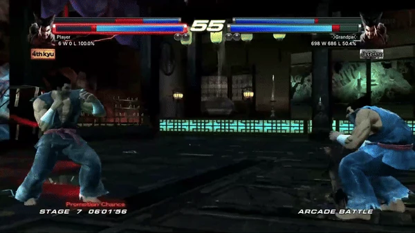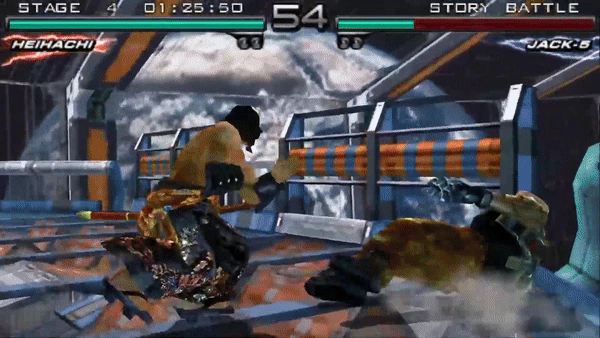 In its debut form, Heihachi perform a slow-but-powerful left thrusting kick to his opponent's midsection. Following its reanimation the move is now a lunging left knee to the midsection. It is useful as a counter-hit tool as it induces a launch.