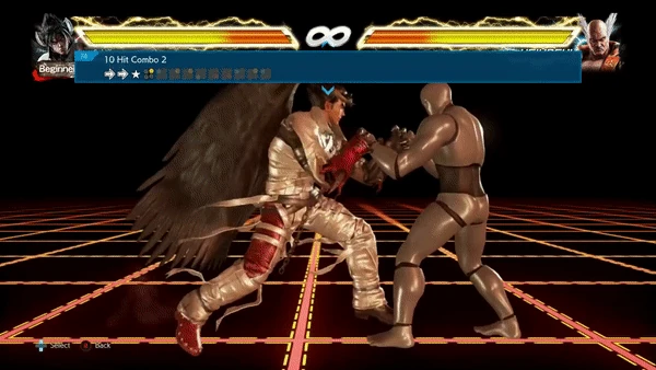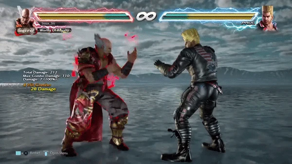 During the animation, the character performs a right to Left Right Combo flurry followed by a Back Fist to Side High Kick, a Right Splits Kick, a low right kick, two left-right uppercuts akin to Twin Pistons, and then finishing the combo with a Dragon Uppercut. The input for this generic combo is (f,f,N,2,1,2,2,3,4,4,1,2,1). If all the strings connect, the combo will deal a whopping 113 damage (88 in Tekken, 93 in Tekken 5)