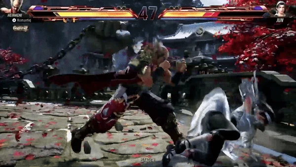 Heihachi swings his left fist across his opponent's midsection in an outward swat then delivers a leaping right knee that will knock the opponent down. The second hit is hit-confirmable.