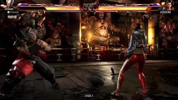 Heihachi performs a right front kick to the opponent's face.