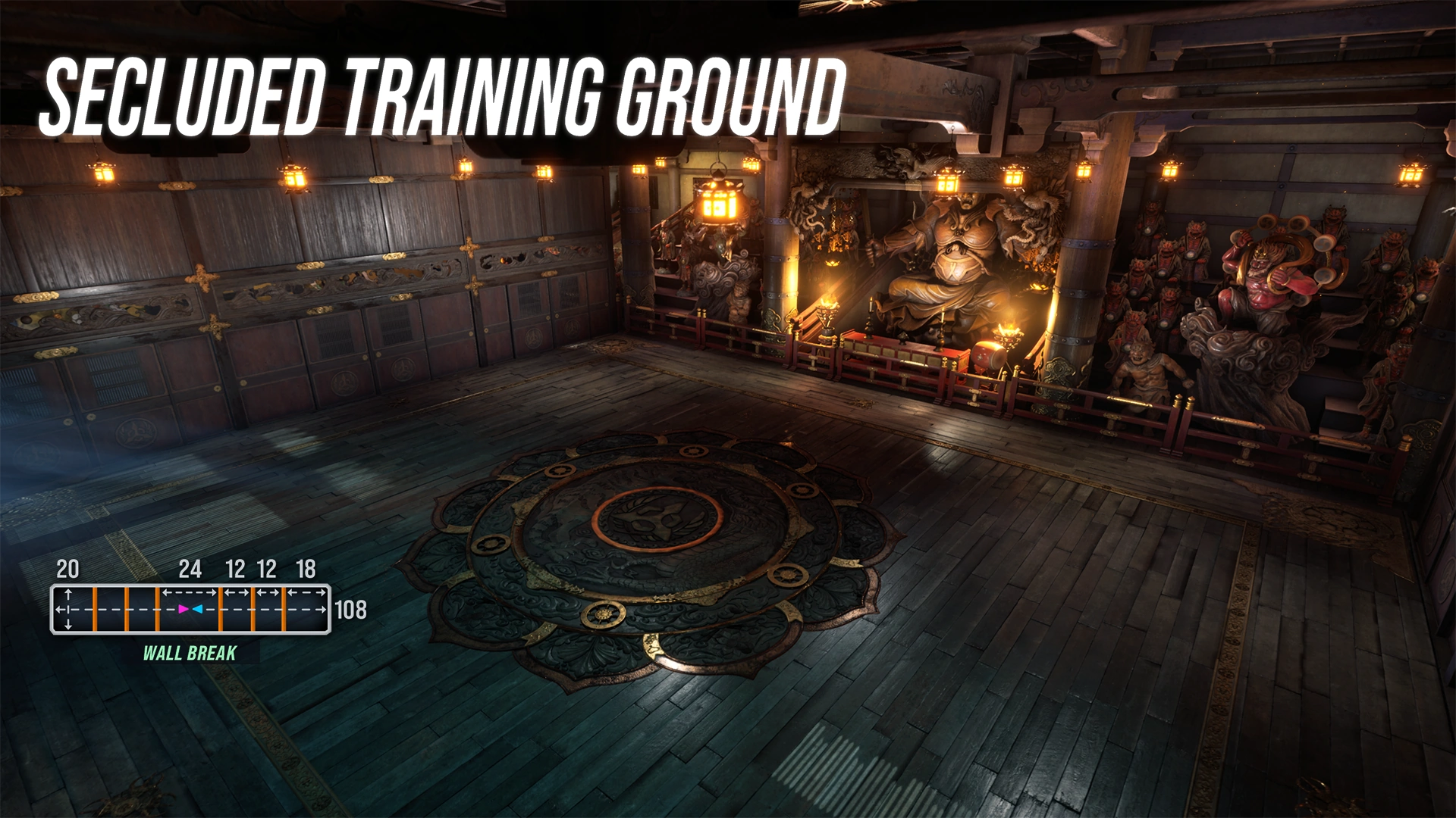 A giant Nio statue, a guardian of the Buddha in Japanese Buddhism, sits in the center of the stage. To the left and right of the center sit the Shinto deities Fujin the god of wind, and Rajin the god of thunder as well as other smaller statues beside them, Mishima Zaibatsu's logos can be seen on each gate. In either lengthwise direction there are three Wall Breaks. Like Howard Estate, multiple Wall Breaks can be used in a single combo.