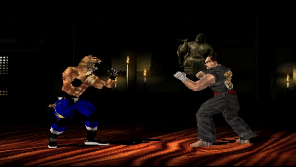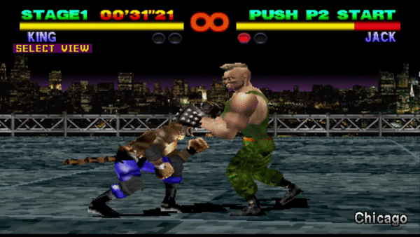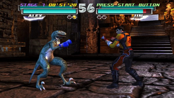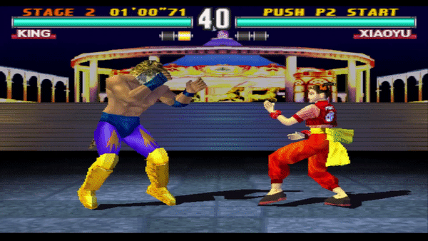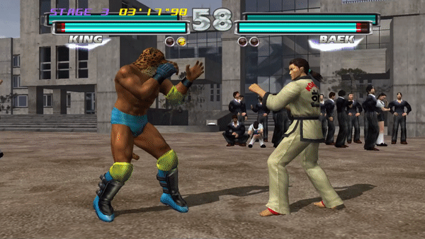 Starting with Tekken 2, King can also chain a single Stagger Kick into a Spinning Uppercut. If the Stagger Kicks are a counter hit, he can use the Spinning Uppercut after any kick, or chain into his powerful Octopus Special throw with 2~1~3 as the fourth hit lands, typically leading to an instant K.O.