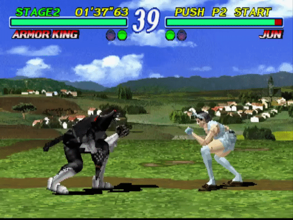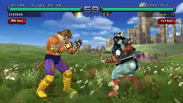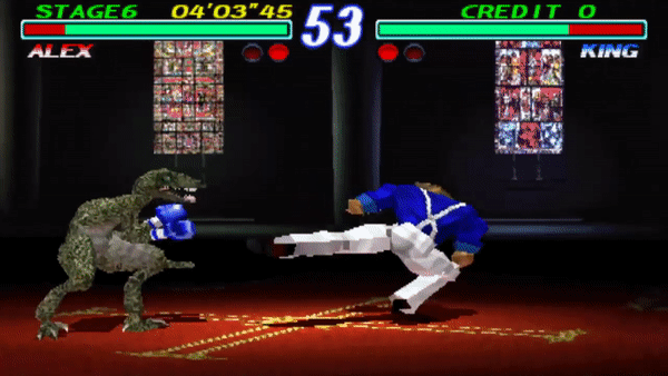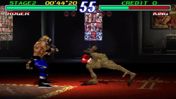 In Tekken, the first two kicks are guaranteed on hit, with the opponent only able to block the third kick, while the entire string is guaranteed on a counter hit. This was unchanged in Tekken 2 for Armor King, Roger and Alex, however King's Stagger Kick can now be blocked after the first kick, or the second kick on a counter hit.