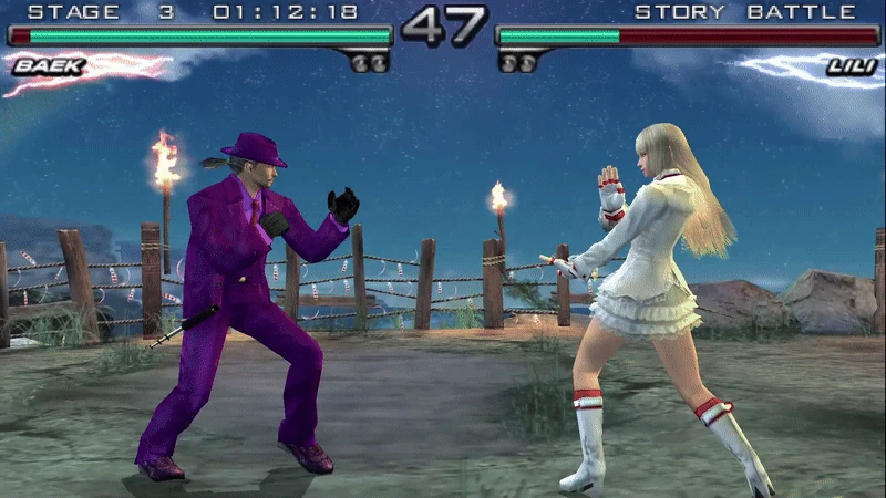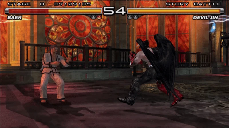 Like Kazuya Mishima's Tsunami Kick, Baek can also perform the attack with d/f+4,4 for more damage. In the Ver.A arcade edition of Tekken 2, the d/f+4, 4 variation was a natural combo, however in Tekken 2 Ver.B it is only natural on counter hit. This change was reverted when Baek returned in Tekken Tag Tournament. Baek also has the added bonus of being able to access the move during Flamingo.