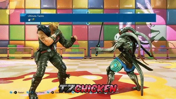 Curiously, an Ultimate Tackle can be reversed like a regular punch, even though it is considered a throw. If reversed, it is treated as a left punch, so the reversal can also be chickened with f+1+3.